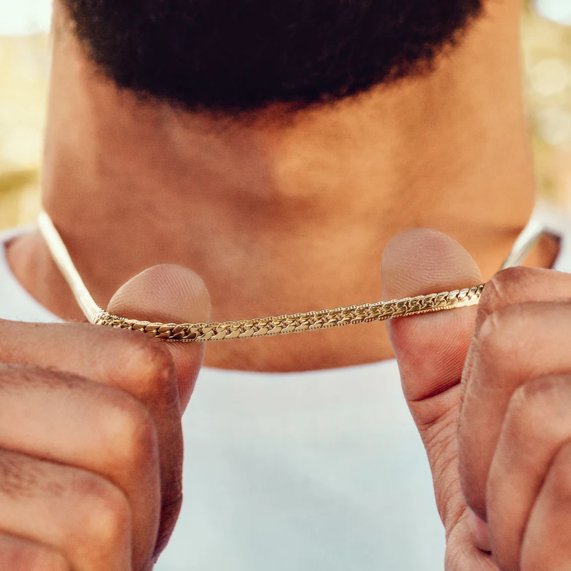 Cadena para hombre con diseño trenzado dorado, ideal para dar un toque moderno y elegante a cualquier look.